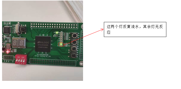 在本次實驗的過程中也發(fā)生了一個編程錯誤問題,剛編寫完上板測試時發(fā)現(xiàn)結(jié)果和預(yù)想的有差異,具體錯處在輸入3元進入雙向流水燈的狀態(tài)時,雙向流水燈正向流水正常,當反向流水時,在倒數(shù)第二個燈會卡住,然后反復(fù)亮滅倒數(shù)一二個燈,沒法完成反向流水。