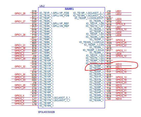 其中key05,key10,就是從外界接入的信號,led[7:0]即輸出信號。接入信號我們要引到對應(yīng)的按鍵,可以參考EF3L40CG332B_DEV的原理圖: