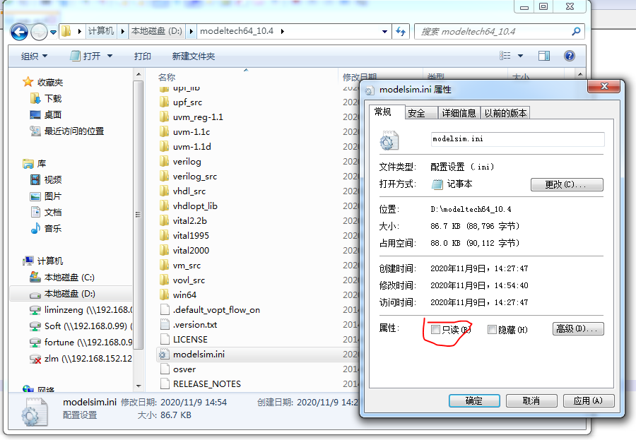 首先在modelsim的安裝目錄下面編輯modelsim的初始化文件modelsim.ini,右鍵屬性后,將它的只讀屬性取消,然后用文本文件(本工程使用的是notepad++)編輯。