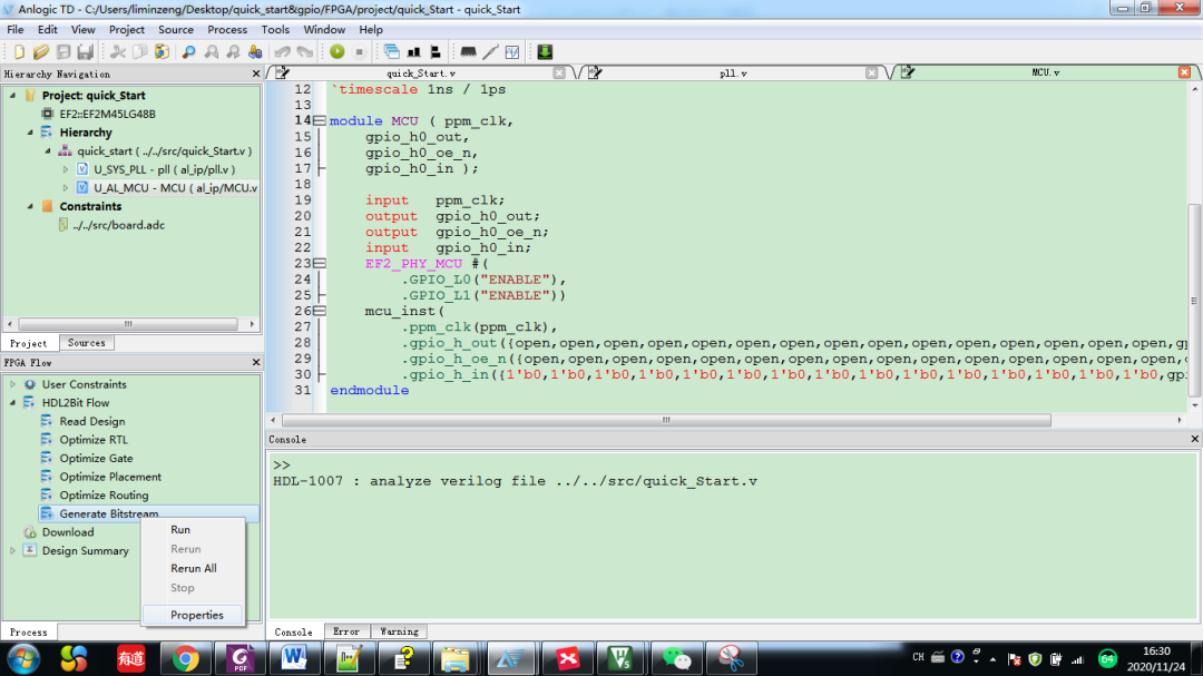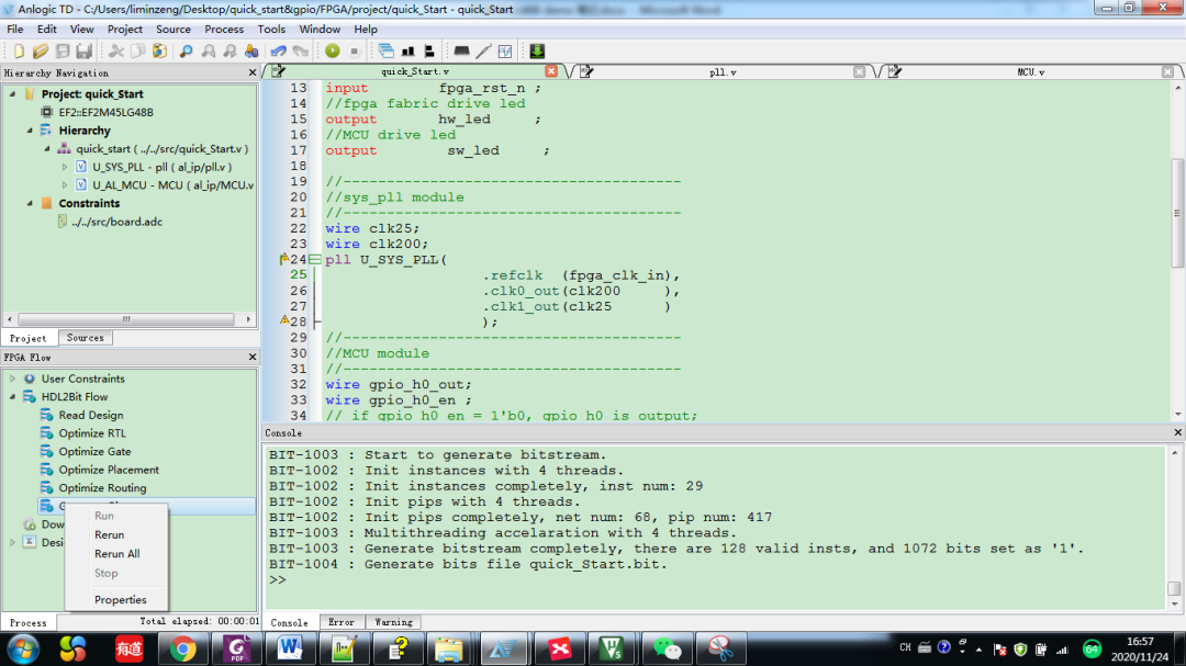 保存后,雙擊generate bitstream編譯TD工程,假如在選擇路徑前已經(jīng)編譯過TD工程了,需要右鍵選擇rerun重新編譯(注意:假如修改了keil的C文件而TD的HDL文件沒有變化,建議也rerun后再將文件下載至開發(fā)板)